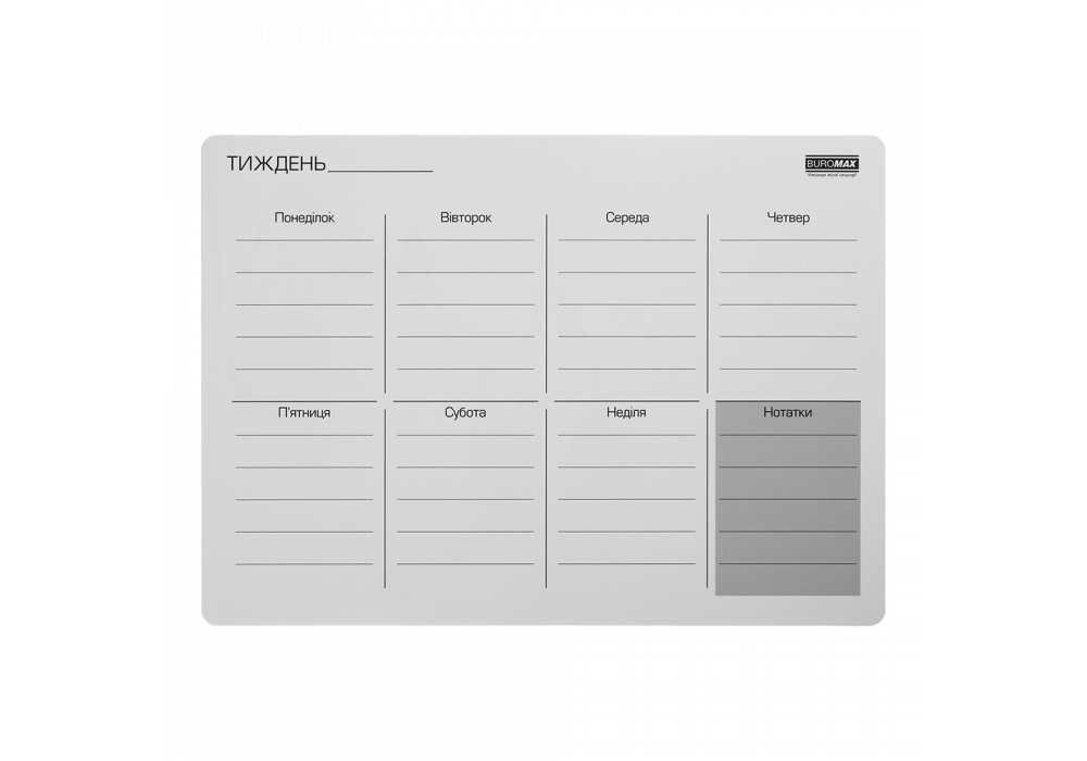 Настінний тижневий магнітний планер від BUROMAX - сучасне зручне та ефективне рішення для планування та візуалізації інформації. Виконаний в класичному стилі, може використовуватися в офісі, студії, на виробництві, а також в побуті. формат А3 (розмір 425х305х5 мм) орієнтація горизонтальна біла поверхня, має лініювання на 7 днів тижня покриття спеціальною ПЕТ-плівкою, придатне для письма маркерами сухого стирання надписи стираються спеціальною губкою поверхня витривала до багаторазового використання, не дряпається, не створює неприємних скрипучих звуків при письмі основа з магнітного вінілу для кріплення планера на металеву поверхню -