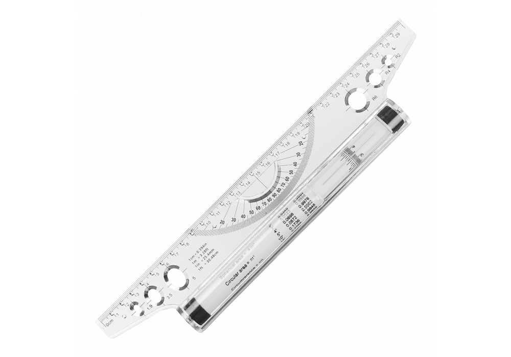Лінійка-рейсшина від BUROMAX застосовується в креслярсько-конструкторських роботах, дозволяє креслити паралельні вертикальні і горизонтальні лінії. роликова крок переміщення 1 мм (нанесення в мм та дюймах) шкала вимірювання 30 см (300 мм) виготовлена з міцного ударовитривалого прозорого пластику нанесення виконане стійким до стирання друком чорного кольору металевий ролик має прогумовані накладки на кінцях, що перешкоджає сковзанню лінійки на поверхні вбудований транспортир вбудовані трафарети кола радіусом 2 мм, 4 мм, 6 мм та трафарети овалів 1,5 мм, 3,5 мм, 5 мм індивідуальна упаковка: картонна коробка з європідвісом -